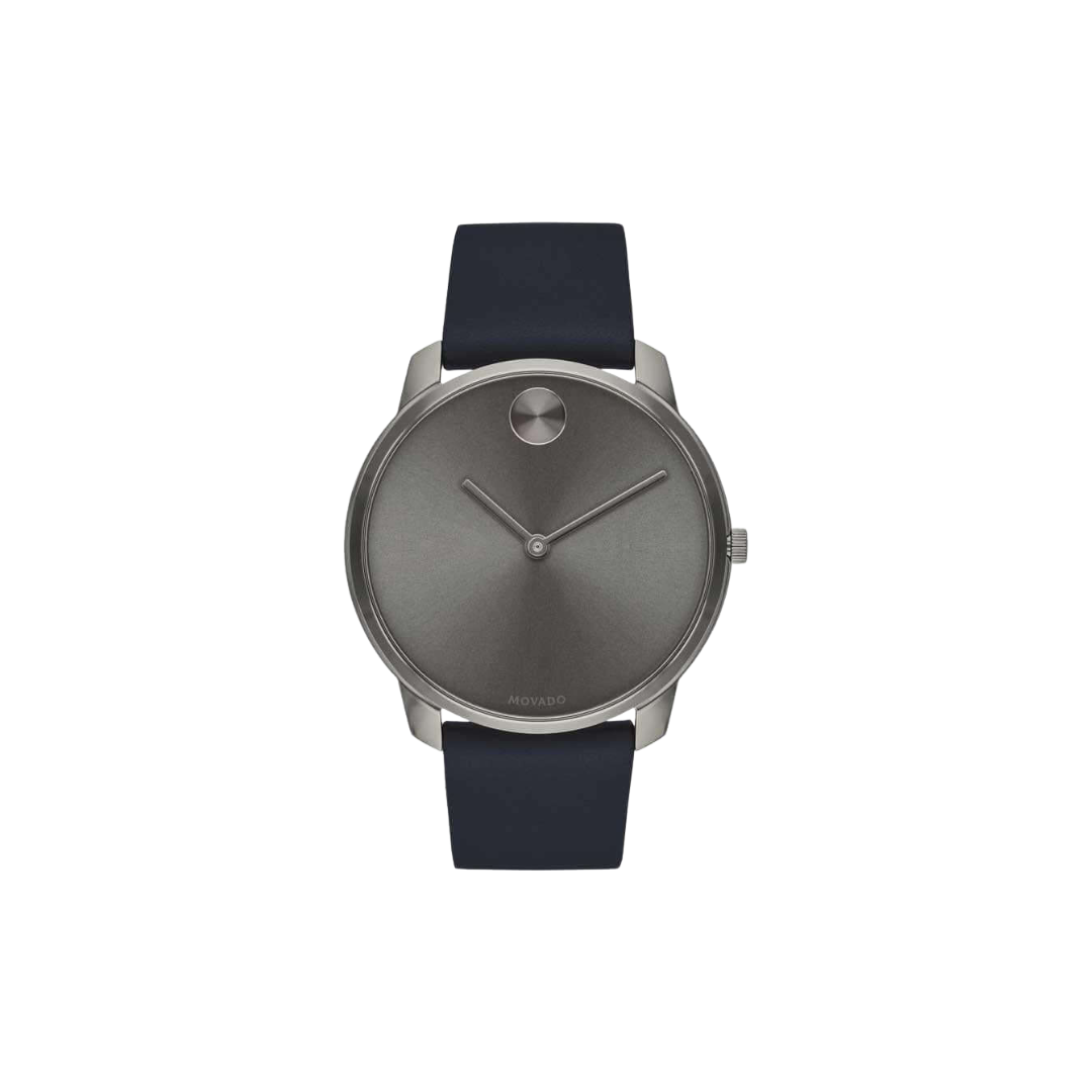 MOVADO BOLD MENS WATCMovado Bold Mens Watch (3600586). Swiss quartz movement. Grey-toned hands. Grey ion-plated dial with Grey-toned dot at the 12 o`clock position. Fixed bezel set on a 42mm Grey ion-plated stainless steel case. K1 crystal on top and a solid case-back. Water resistant to 30M. Blue leather strap with tang-style buckle