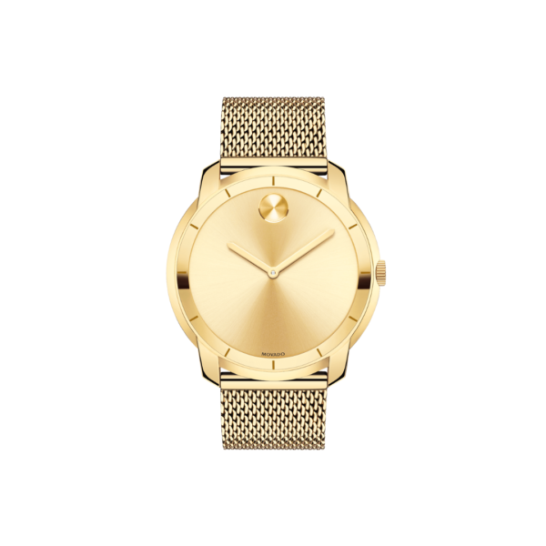 Large Movado BOLD watch, thin 44 mm yellow gold ion-plated stainless steel case, K1 crystal with a ring of gold-toned metallization with gold-toned hour index, gold-toned sunray dial with matching sunray dot and hands, yellow gold ion-plated stainless steel mesh-link bracelet with mesh-textured back sizing links, deployment clasp.