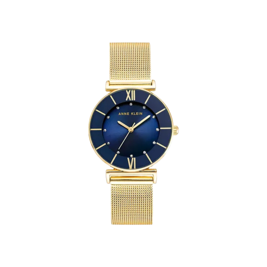 Brand Name Anne Klein Model number AK/3780NVGB Part Number AK/3780NVGB Item Shape Round Dial Window Material Type Mineral Glass Display Type Analog Clasp Type Sliding Clasp Case Material Metal Case Diameter 32 millimetres Case Thickness 8 millimetres Band Material Stainless Steel Band size Standard length Band Width 16 millimetres Band Colour Gold Dial Colour Blue Bezel Material Metal Bezel Function Stationary Special Features Waterproof Movement Japanese Quartz