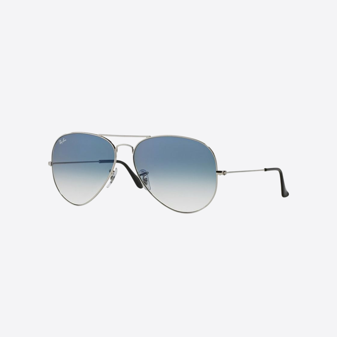 Ray-Ban 3025 Aviator Classic sunglasses. These pilot-shaped glasses feature a polished black & silver metal frame that exudes timeless elegance. The classic blue faded lenses provide superior color contrast and are ideal for those who prefer a more natural vision experience. Offering 100% UV protection, these shades are not only stylish but also practical. Embrace the classic look with these iconic Aviator sunglasses.