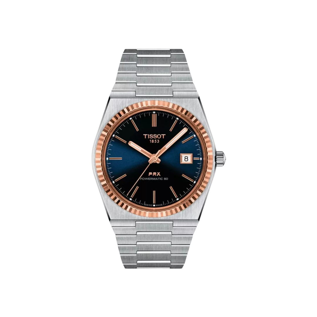 The Tissot T-Classic PRX Powermatic 80 Men’s Watch T931.407.41.041.00 is an elegant model with a 316L stainless steel case and bracelet, a navy blue dial and an 18 ct rose gold bezel. It is based on the Swiss Powermatic 80.111 automatic movement, which is mounted on 23 jewels and has a power reserve of 80 hours, and is equipped with the Nivachron anti-magnetic system. The dial has a date stamp of the days of the month and is secured with an anti-reflective sapphire crystal. The Tissot T-Classic PRX Powermatic 80 T9314074104100 watch is water resistant to 10 ATM.