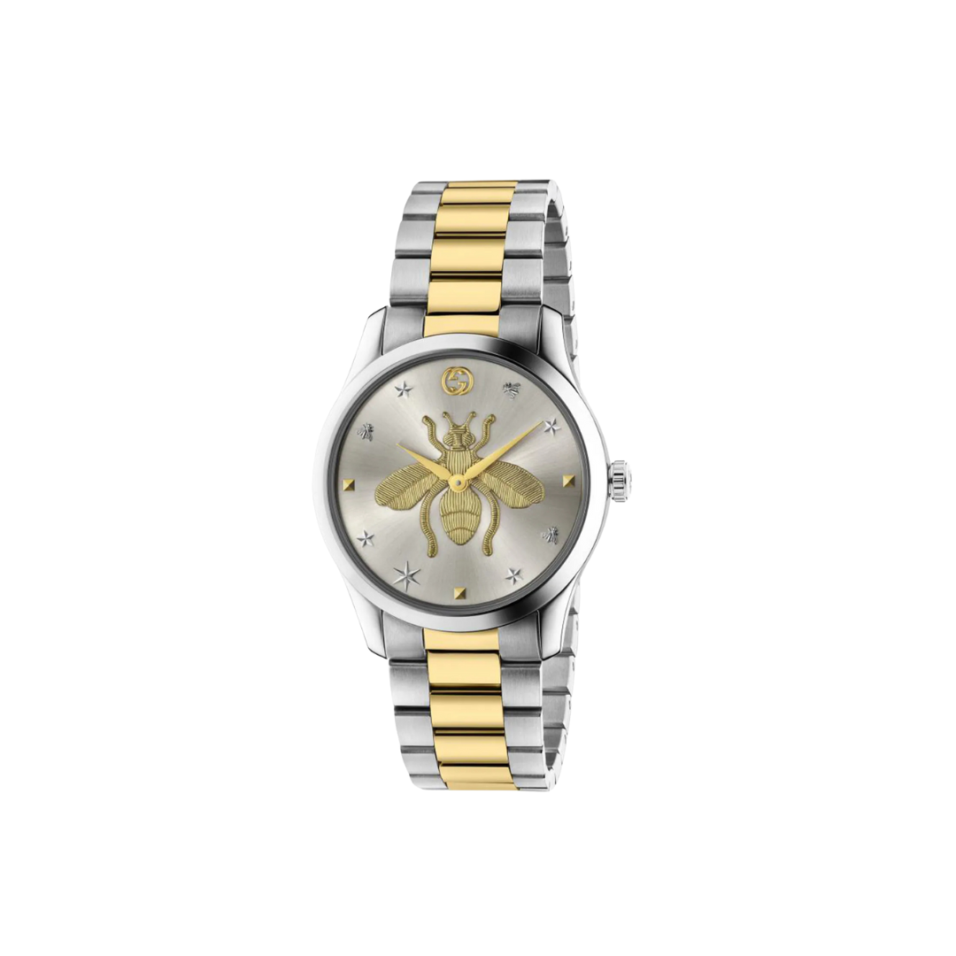 This expertly crafted men’s Gucci watch from the Timeless Fashion collection features an elegant 38mm Stainless Steel case which showcases baton hour markers and a stunning Silver-tone dial, all protected by Sapphire crystal glass.